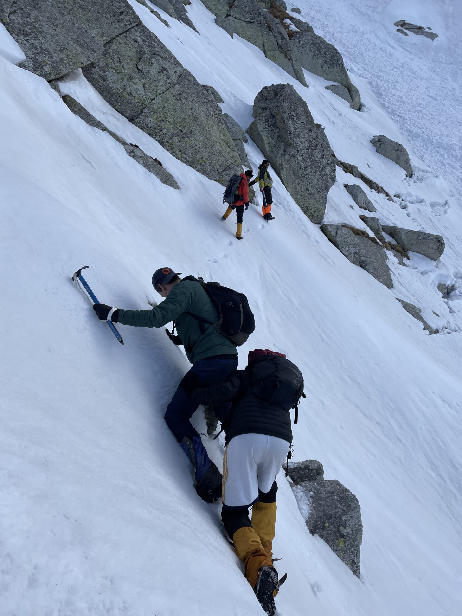 The trail is steep, with rocky boulders and occasional snow patches depending on the season.